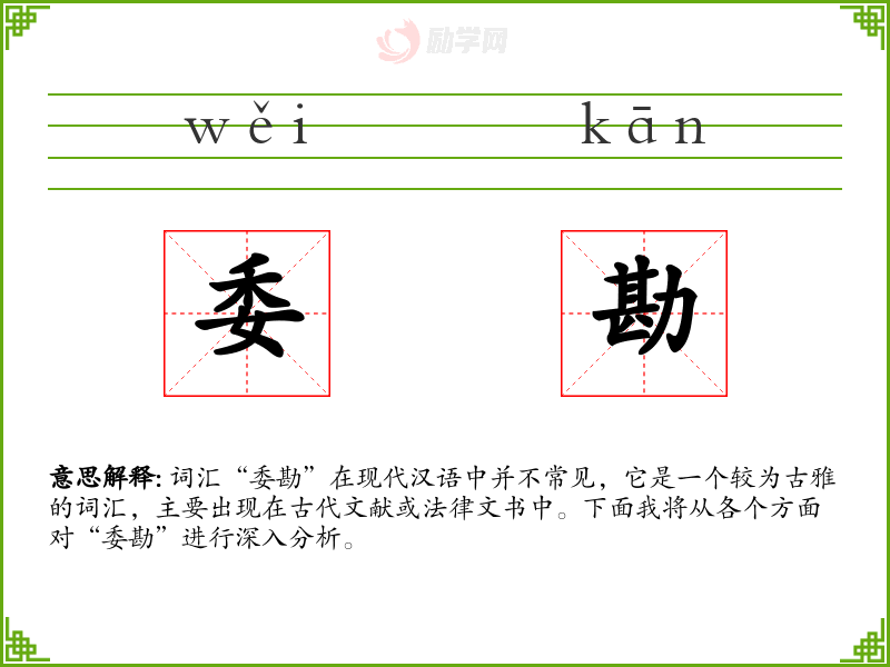词汇“委勘”在现代汉语中并不常见,它是一个较为古雅的词汇,主要出现在古代文献或法律文书中。下面我将从各个方面对“委勘”进行深入分析。
