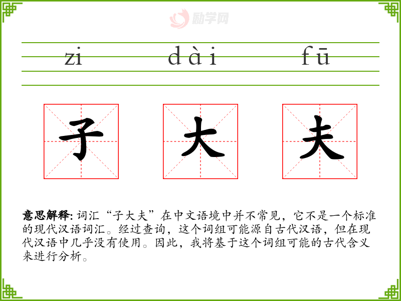 词汇“子大夫”在中文语境中并不常见,它不是一个标准的现代汉语词汇。经过查询,这个词组可能源自古代汉语,但在现代汉语中几乎没有使用。因此,我将基于这个词组可能的古代含义来进行分析。