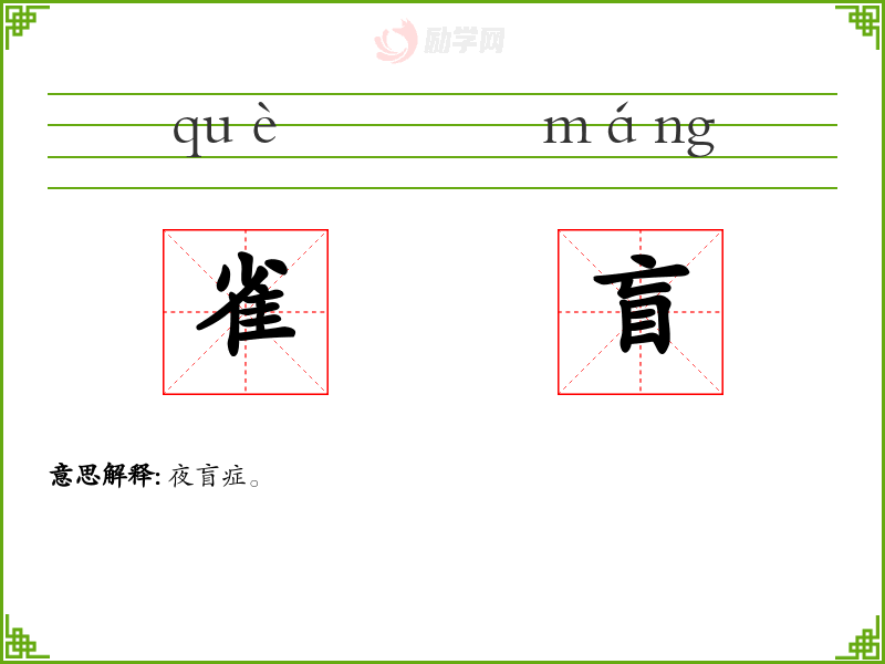 《说文》-盲,目无牟子也。 《韩非子·解老》-目不能决黑白之色则谓之盲。 《论衡·别通》-目不见青黄曰盲。 《老子》-五色令人目盲;五音令人耳聋。 《三国志·陈思王植传》注-丁椽,好士也,即使其两目盲,尚当与女,何况但眇?