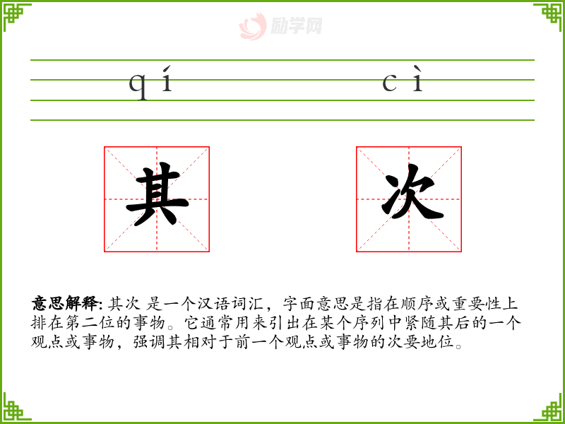 其次 是一个汉语词汇,字面意思是指在顺序或重要性上排在第二位的事物。它通常用来引出在某个序列中紧随其后的一个观点或事物,强调其相对于前一个观点或事物的次要地位。