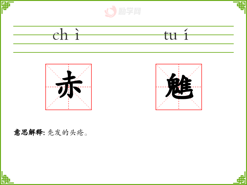 《说文》-赤,南方色也。 《书·洪范·五行传》-赤者,火色也。 《素问·风论》。注:“赤者,心色也。”-其色赤。 《书·顾命》。郑注:“武王诛纣时刀赤为饰。”-赤刀。 《齐民要术·种椒》-色赤椒好。 《易·困卦》。郑注:“朱深曰赤。”-困于赤绂。 姚鼐《登泰山记》。又如:赤刀(刀口赤色的宝刀);赤衣(红色衣服);赤丸(红色弹丸);赤日(红日;烈日);赤石(红色的石头);赤泥(呈红色的泥土)-日上,正赤如丹。