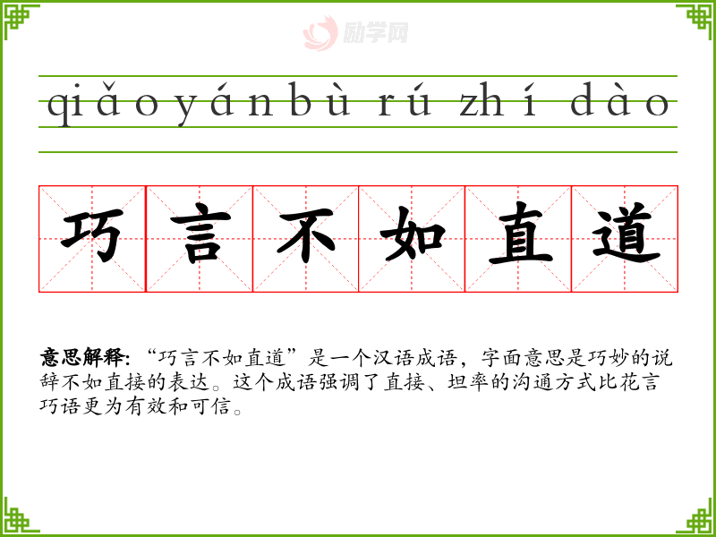 “巧言不如直道”是一个汉语成语,字面意思是巧妙的说辞不如直接的表达。这个成语强调了直接、坦率的沟通方式比花言巧语更为有效和可信。