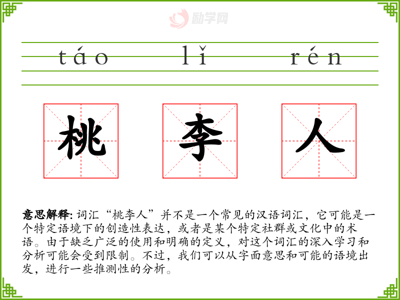 在**文化中,“桃李”常用来比喻老师的众多学生或弟子的成就,因此“桃李人”可能在这样的文化背景下被创造出来,用以强调教育的重要性和老师的影响力。