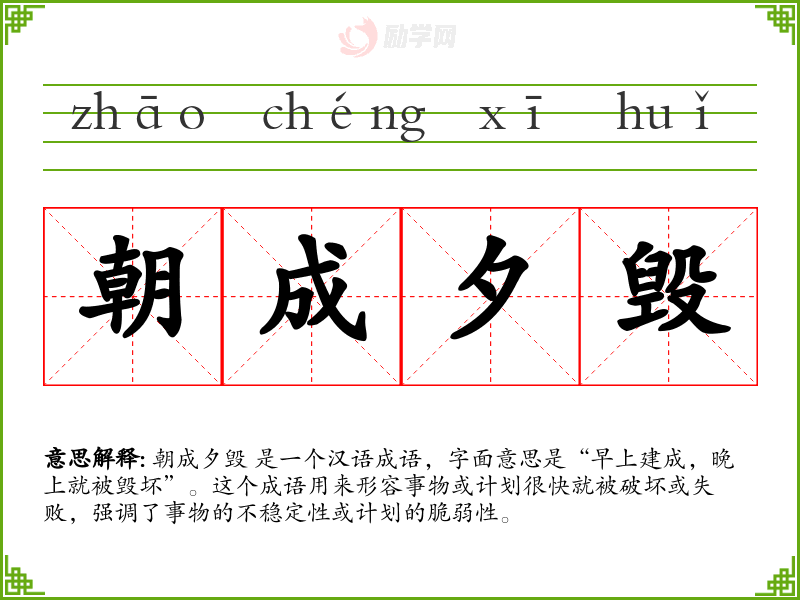 朝成夕毁 这个成语深刻地揭示了事物的不稳定性和变化无常的本质。在学*语言和表达时,理解和运用这样的成语能够丰富我们的表达方式,并帮助我们更好地理解和应对生活中的变化。