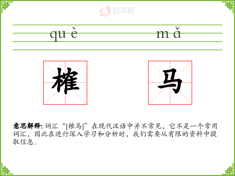 词汇“[榷马]”在现代汉语中并不常见,它不是一个常用词汇,因此在进行深入学*和分析时,我们需要从有限的资料中提取信息。