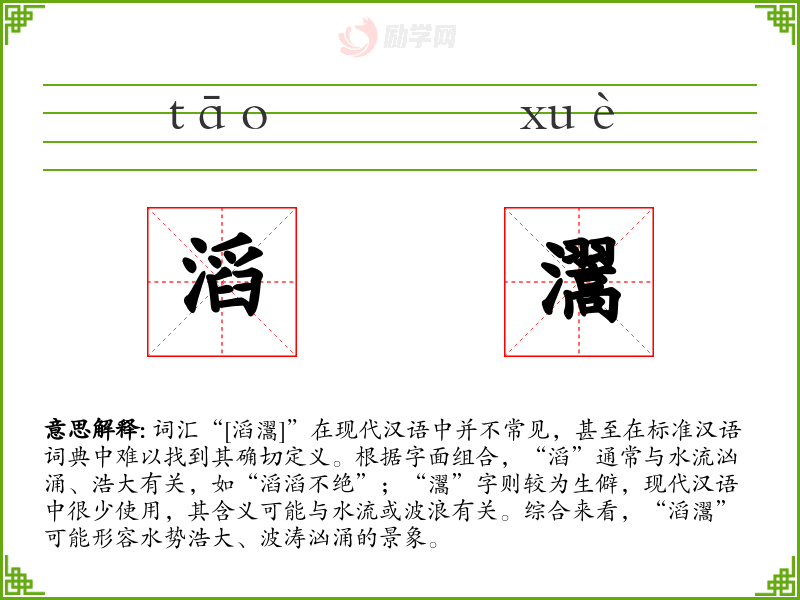 词汇“[滔瀥]”在现代汉语中并不常见,甚至在标准汉语词典中难以找到其确切定义。根据字面组合,“滔”通常与水流汹涌、浩大有关,如“滔滔不绝”;“瀥”字则较为生僻,现代汉语中很少使用,其含义可能与水流或波浪有关。综合来看,“滔瀥”可能形容水势浩大、波涛汹涌的景象。