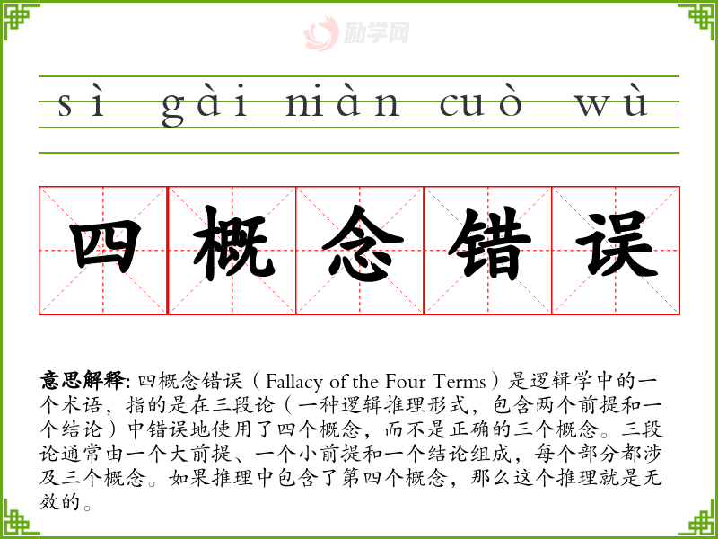 四概念错误是逻辑学中的一个基础概念,对于理解和应用逻辑推理至关重要。在语言学习和表达中,理解并避免这种逻辑错误可以提高我们的论证质量和逻辑思维能力。