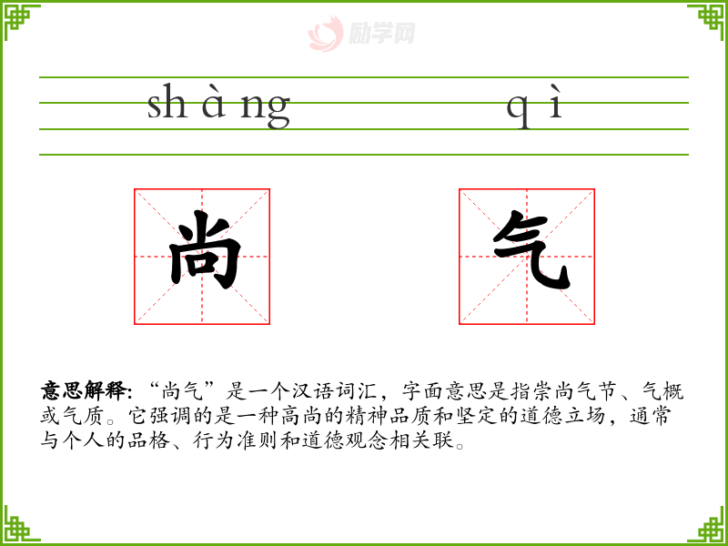 “尚气”是一个汉语词汇,字面意思是指崇尚气节、气概或气质。它强调的是一种高尚的精神品质和坚定的道德立场,通常与个人的品格、行为准则和道德观念相关联。