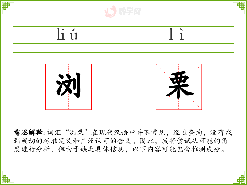 由于“浏栗”不是一个标准词汇,我们无法给出确切的字面意思和基本含义。它可能是某个方言词汇、网络新词或者是打字错误。