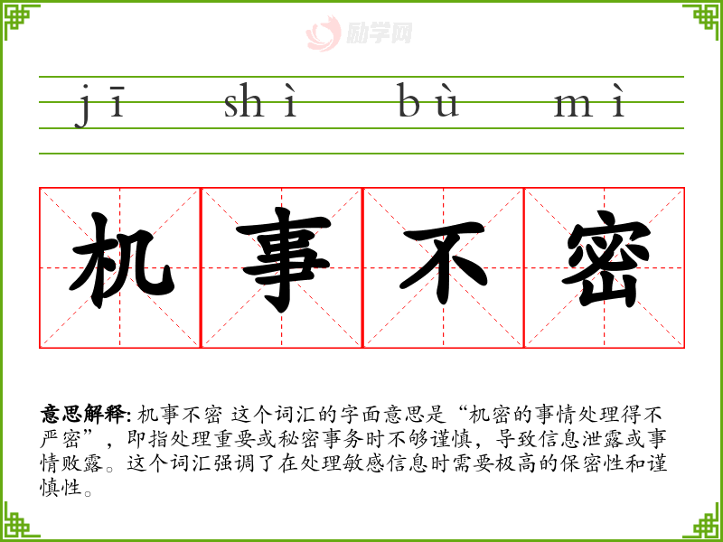 机事不密 这个词汇的字面意思是“机密的事情处理得不严密”,即指处理重要或秘密事务时不够谨慎,导致信息泄露或事情败露。这个词汇强调了在处理敏感信息时需要极高的保密性和谨慎性。