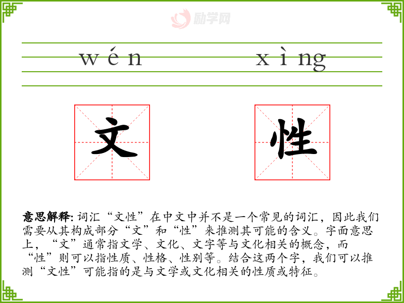 词汇“文性”在中文中并不是一个常见的词汇,因此我们需要从其构成部分“文”和“性”来推测其可能的含义。字面意思上,“文”通常指文学、文化、文字等与文化相关的概念,而“性”则可以指性质、性格、性别等。结合这两个字,我们可以推测“文性”可能指的是与文学或文化相关的性质或特征。