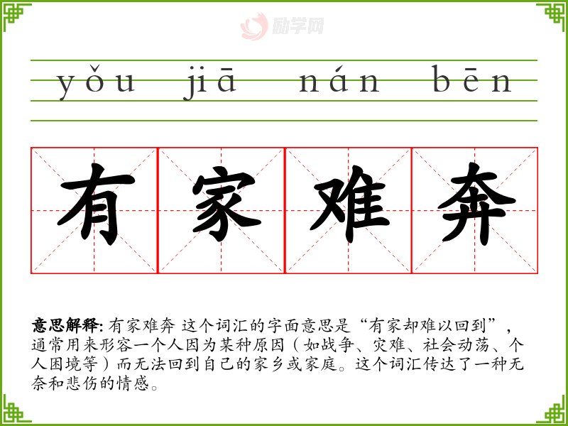 有家难奔 这个词汇的字面意思是“有家却难以回到”,通常用来形容一个人因为某种原因(如战争、灾难、社会动荡、个人困境等)而无法回到自己的家乡或家庭。这个词汇传达了一种无奈和悲伤的情感。