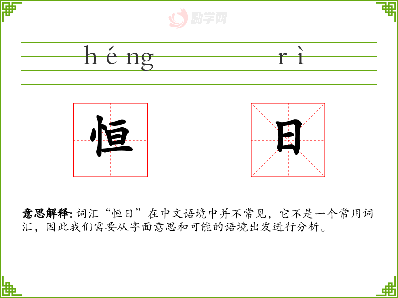 词汇“恒日”在中文语境中并不常见,它不是一个常用词汇,因此我们需要从字面意思和可能的语境出发进行分析。