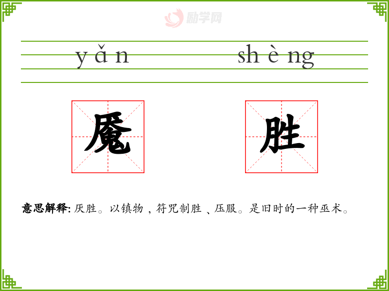 魇胜的意思是:厌胜。以镇物﹐符咒制胜﹑压服。是旧时的一种巫术。
