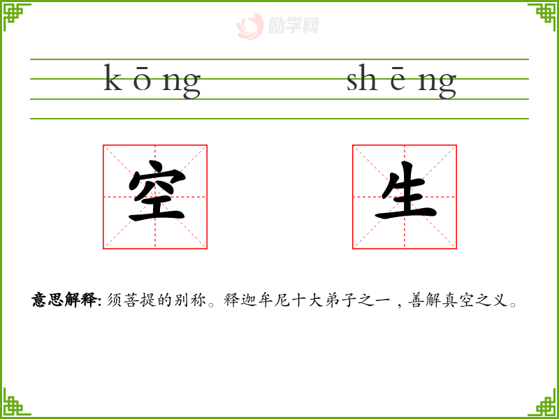 空生的意思是:须菩提的别称。释迦牟尼十大弟子之一﹐善解真空之义。
