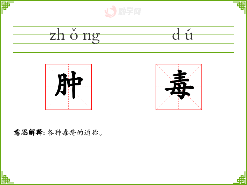 《说文》-肿,痈也。 《论衡·状留》-肉暴长曰肿。 《周礼·疡医》。注:“痈而上创者。”-肿疡。 《吕氏春秋·尽数》-郁处头,则为肿为风。 《周礼·天官》。郑玄注:“肿疡,痈而上生疮者”-疡医掌肿疡。