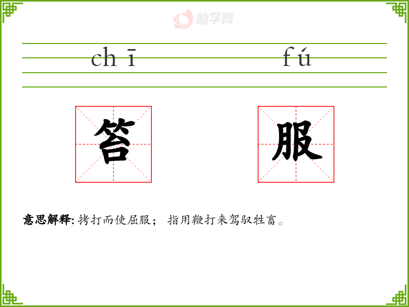 笞服的意思是:拷打而使屈服; 指用鞭打来驾驭牲畜。