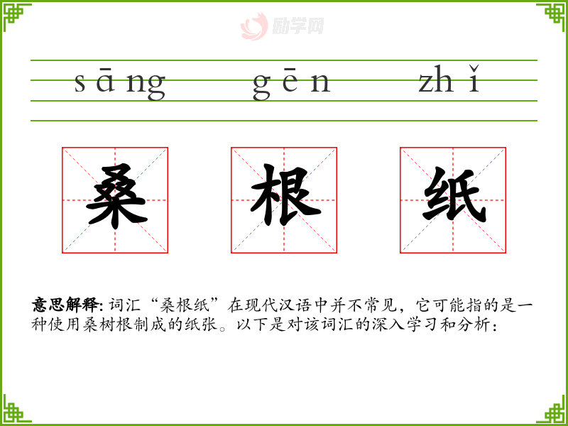 “桑根纸”是一个特定且不常见的词汇,它可能与*的传统工艺和文化有关。在学这个词汇时,可以更深入地了解**的历史和文化,以及古代人们如何利用自然资源。尽管在现代使用较少,但它仍然是语言和文化多样性的一部分。
