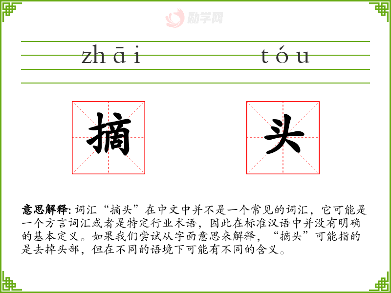 由于“摘头”不是一个标准汉语词汇,我们无法给出一个确切的基本定义。它可能是某个地区或行业的特定用语。