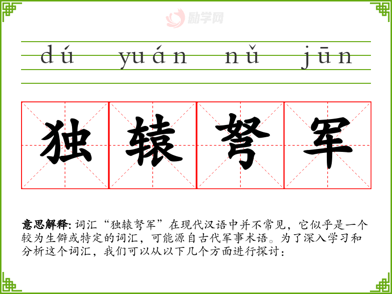 词汇“独辕弩军”在现代汉语中并不常见,它似乎是一个较为生僻或特定的词汇,可能源自古代军事术语。为了深入学*和分析这个词汇,我们可以从以下几个方面进行探讨: