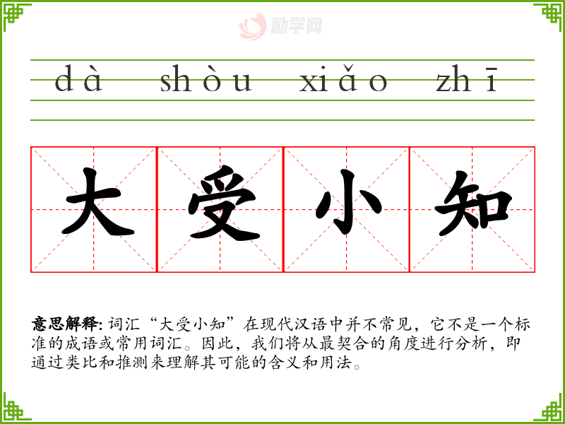 词汇“大受小知”在现代汉语中并不常见,它不是一个标准的成语或常用词汇。因此,我们将从最契合的角度进行分析,即通过类比和推测来理解其可能的含义和用法。