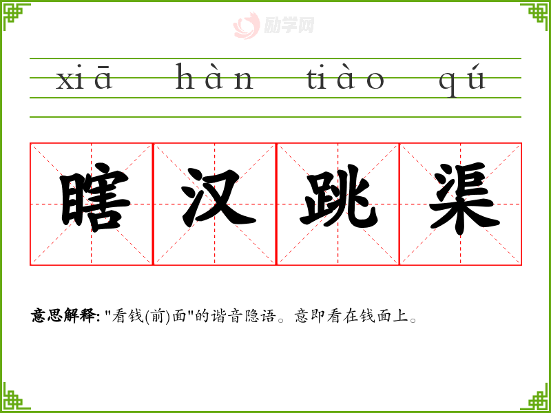 1.瞎汉跳渠的拼音是什么?瞎汉跳渠怎么读?