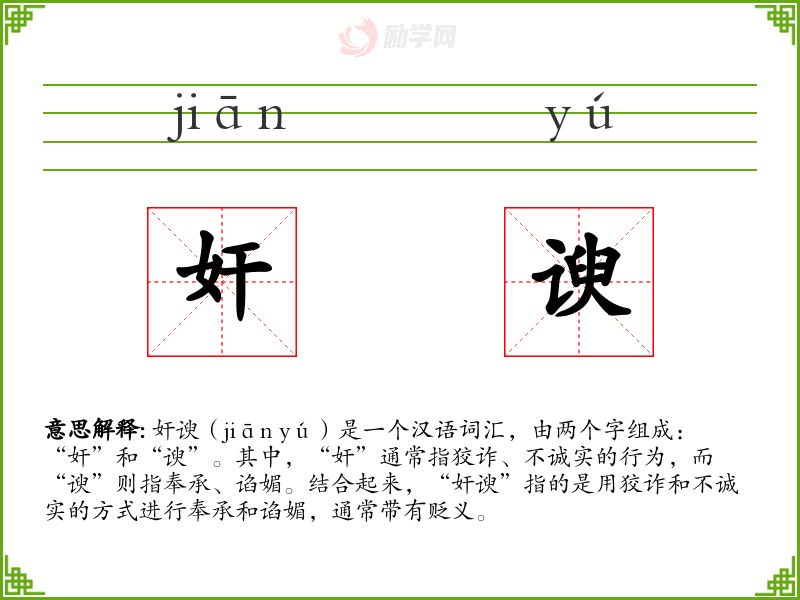 奸谀(jiān yú)是一个汉语词汇,由两个字组成:“奸”和“谀”。其中,“奸”通常指狡诈、不诚实的行为,而“谀”则指奉承、谄媚。结合起来,“奸谀”指的是用狡诈和不诚实的方式进行奉承和谄媚,通常带有贬义。