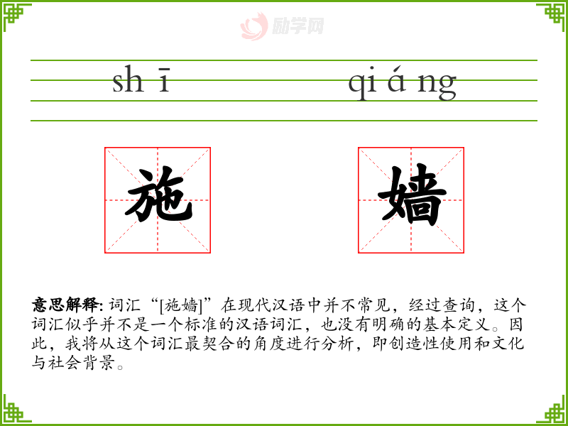 词汇“[施嫱]”在现代汉语中并不常见,经过查询,这个词汇似乎并不是一个标准的汉语词汇,也没有明确的基本定义。因此,我将从这个词汇最契合的角度进行分析,即创造性使用和文化与社会背景。