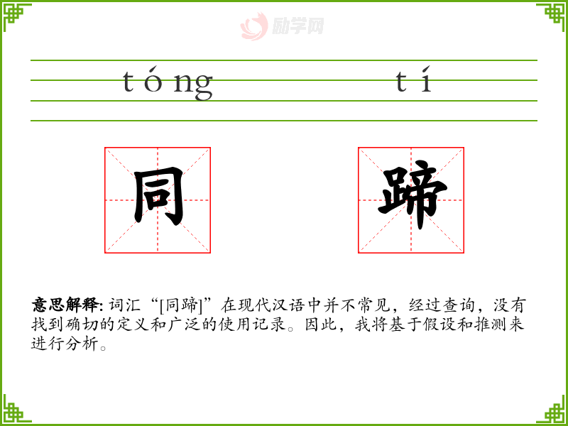 由于“[同蹄]”不是一个常用词汇,对其的理解和应用可能需要更多的语境和背景信息。在语言学习和表达中,了解和掌握常用词汇更为重要,但探索和理解非常用词汇也能丰富语言知识和表达能力。