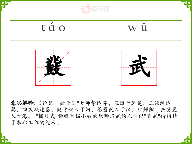 鼗武的意思是:《论语.微子》"大师挚适齐,亚饭干适楚,三饭缭适蔡,四饭缺适秦,鼓方叔入于河,播鼗武入于汉,少师阳﹑击磬襄入于海。""播鼗武"指殷时摇小鼓的乐师名武的人◇以"鼗武"借指精于本职工作的能人。