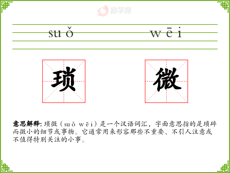 琐微(suǒ wēi)是一个汉语词汇,字面意思指的是琐碎而微小的细节或事物。它通常用来形容那些不重要、不引人注意或不值得特别关注的小事。