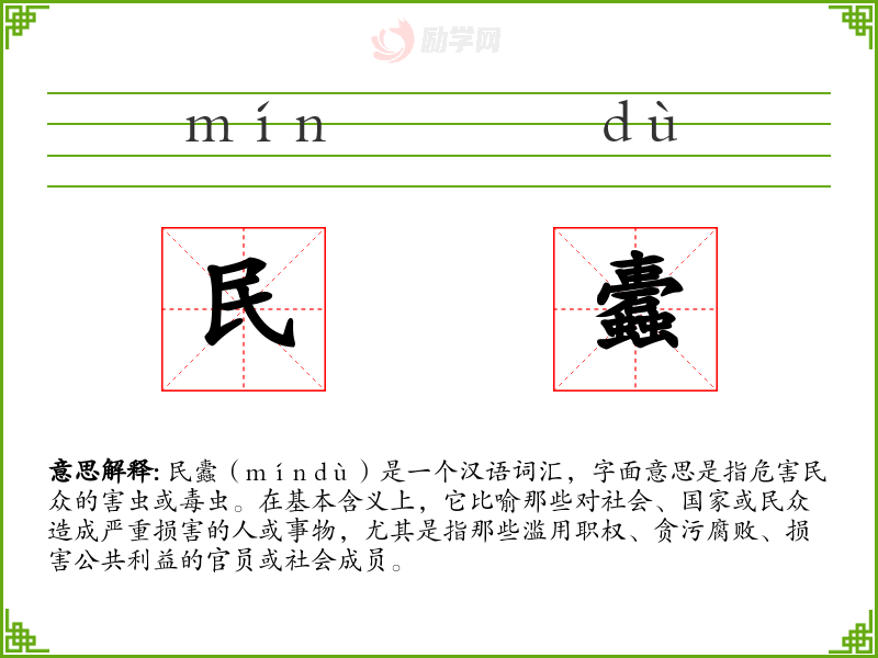 民蠹(mín dù)是一个汉语词汇,字面意思是指危害民众的害虫或毒虫。在基本含义上,它比喻那些对社会、国家或民众造成严重损害的人或事物,尤其是指那些滥用职权、贪污腐败、损害公共利益的官员或社会成员。
