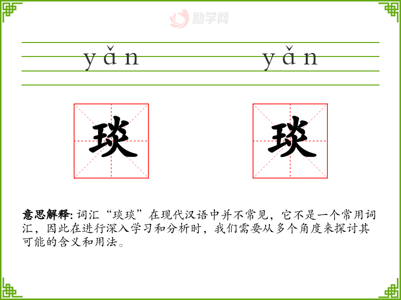 词汇“琰琰”在现代汉语中并不常见,它不是一个常用词汇,因此在进行深入学*和分析时,我们需要从多个角度来探讨其可能的含义和用法。