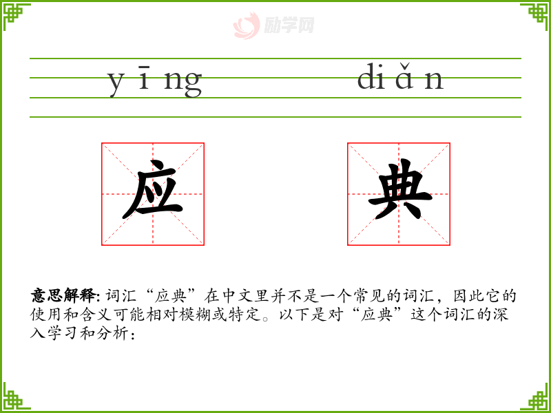 词汇“应典”在中文里并不是一个常见的词汇,因此它的使用和含义可能相对模糊或特定。以下是对“应典”这个词汇的深入学习和分析: