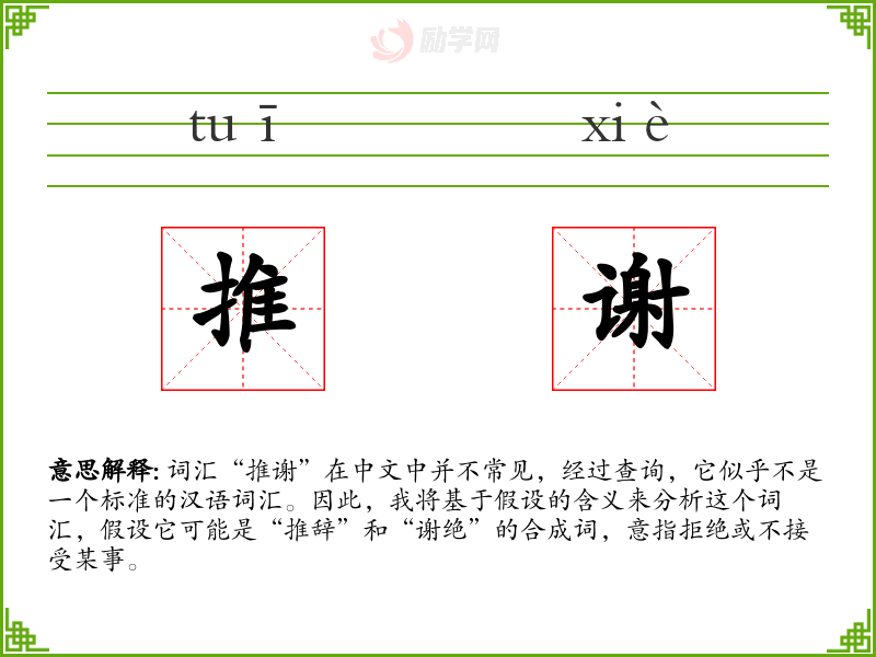 词汇“推谢”在中文中并不常见,经过查询,它似乎不是一个标准的汉语词汇。因此,我将基于假设的含义来分析这个词汇,假设它可能是“推辞”和“谢绝”的合成词,意指拒绝或不接受某事。
