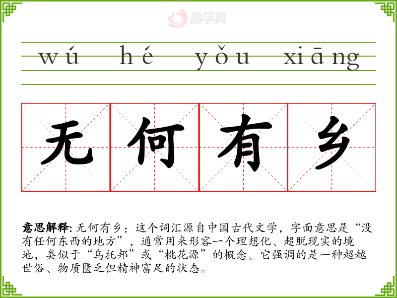 无何有乡:这个词汇源自**古代文学,字面意思是“没有任何东西的地方”,通常用来形容一个理想化、超脱现实的境地,类似于“乌托邦”或“桃花源”的概念。它强调的是一种超越世俗、物质匮乏但精神富足的状态。