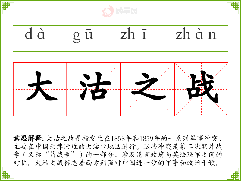 - 在历史课上,我们详细学*了大沽之战,了解了清朝是如何应对西方列强的侵略的。