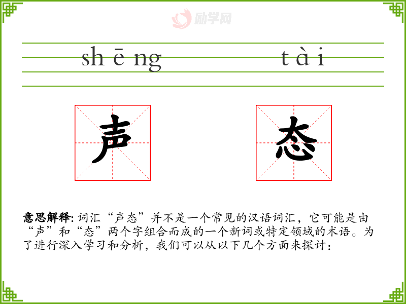 词汇“声态”并不是一个常见的汉语词汇,它可能是由“声”和“态”两个字组合而成的一个新词或特定领域的术语。为了进行深入学习和分析,我们可以从以下几个方面来探讨: