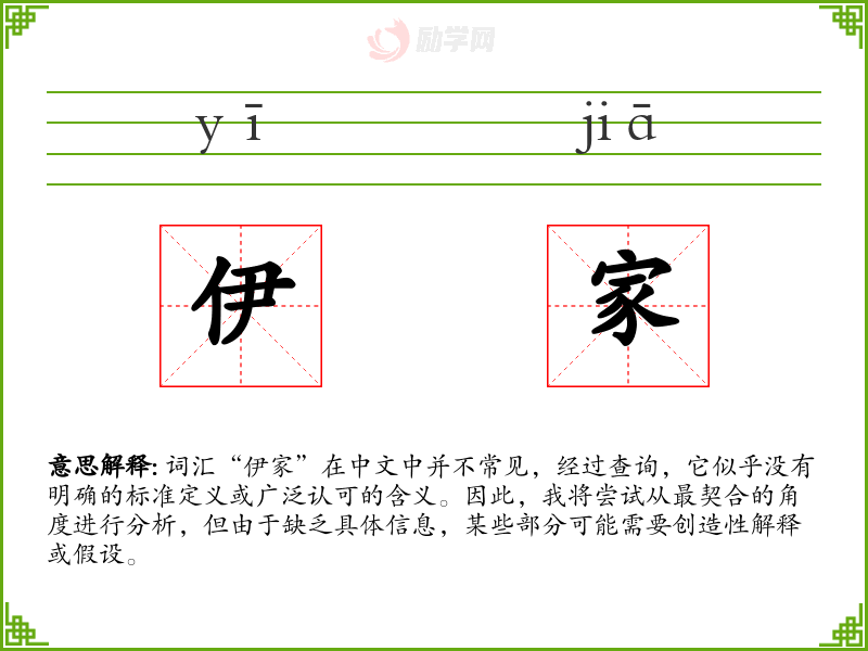 由于“伊家”不是一个标准词汇,我们无法提供确切的基本定义。它可能是某个方言中的词汇,或者是某个特定社群中的术语。