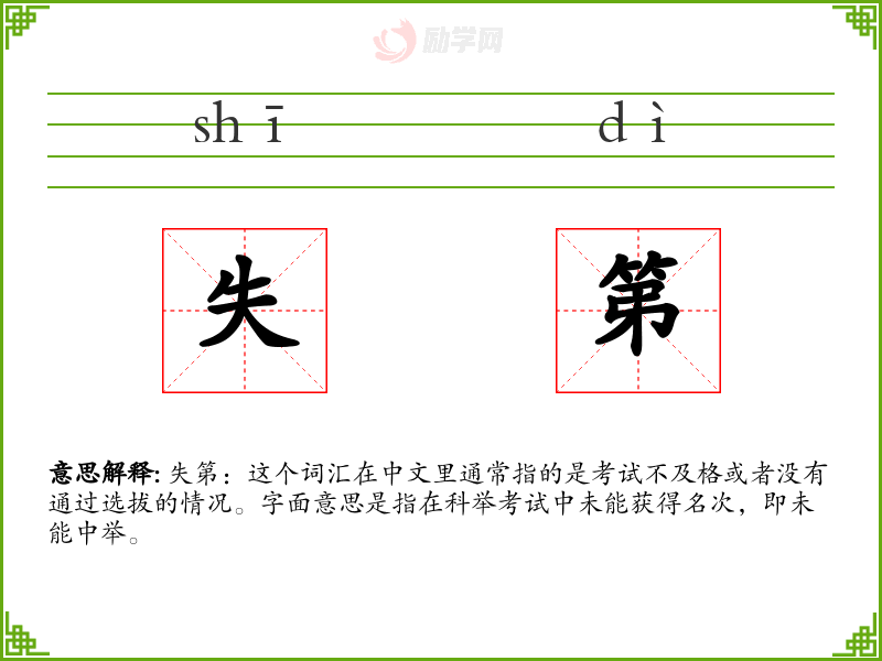 失第:这个词汇在中文里通常指的是考试不及格或者没有通过选拔的情况。字面意思是指在科举考试中未能获得名次,即未能中举。