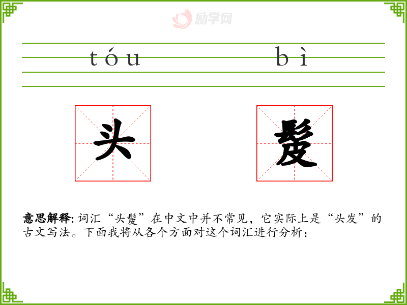 词汇“头髲”在中文中并不常见,它实际上是“头发”的古文写法。下面我将从各个方面对这个词汇进行分析: