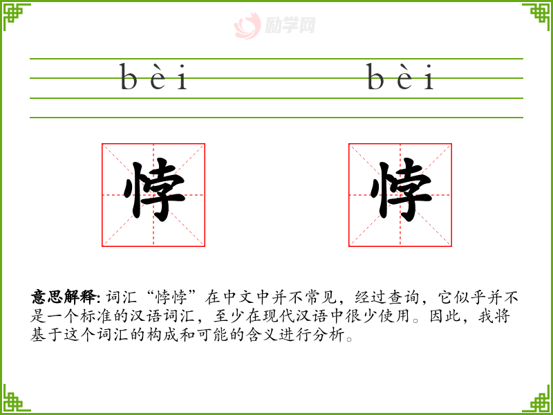 词汇“悖悖”在中文中并不常见,经过查询,它似乎并不是一个标准的汉语词汇,至少在现代汉语中很少使用。因此,我将基于这个词汇的构成和可能的含义进行分析。