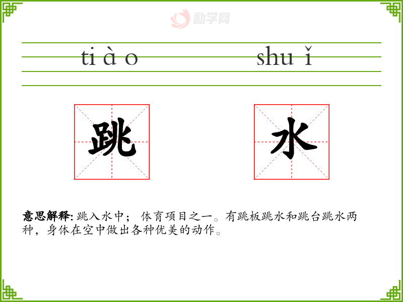 跳水的意思是:跳入水中; 体育项目之一。有跳板跳水和跳台跳水两种,身体在空中做出各种优美的动作。