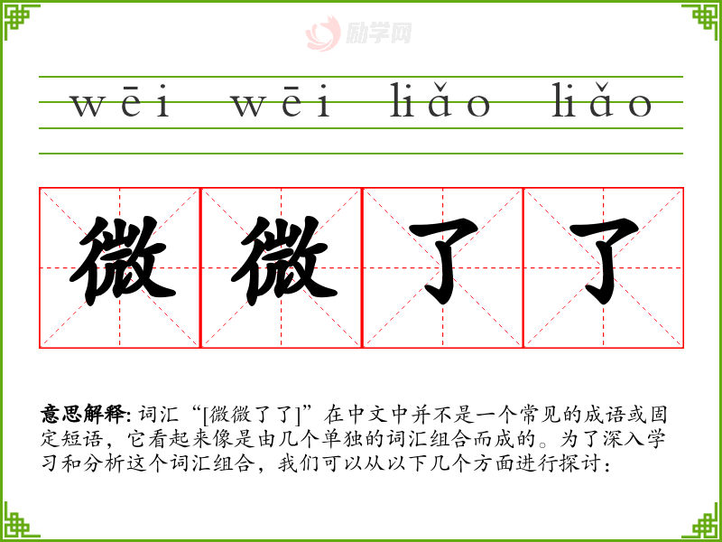 - 通过对“微微了了”的分析,我认识到词汇的组合可以创造出新的意义和用法,这对于语言学习和表达是非常重要的。这个词汇组合提醒我们在表达时要考虑词汇的细微差别和语境的影响。