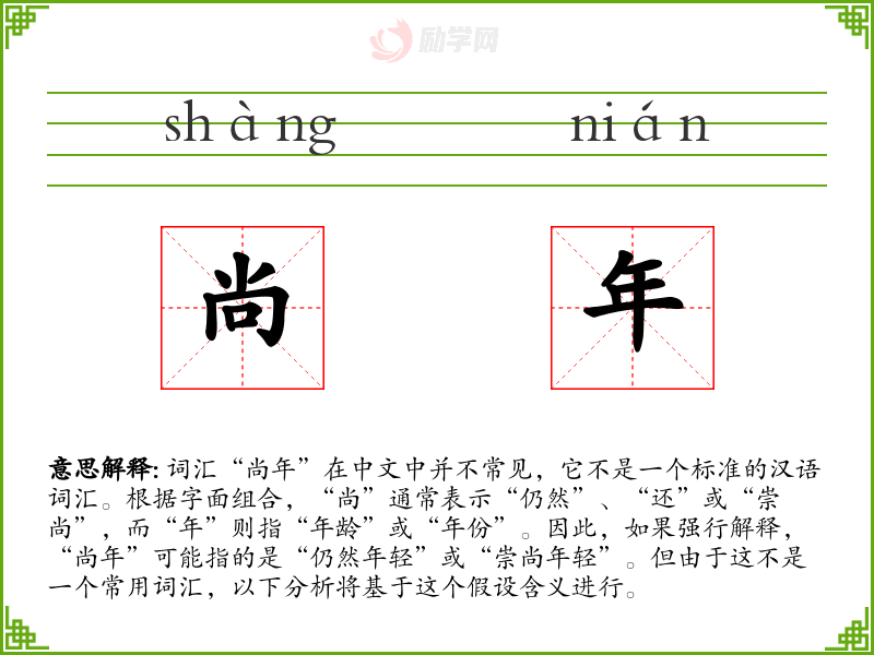 词汇“尚年”在中文中并不常见,它不是一个标准的汉语词汇。根据字面组合,“尚”通常表示“仍然”、“还”或“崇尚”,而“年”则指“年龄”或“年份”。因此,如果强行解释,“尚年”可能指的是“仍然年轻”或“崇尚年轻”。但由于这不是一个常用词汇,以下分析将基于这个假设含义进行。