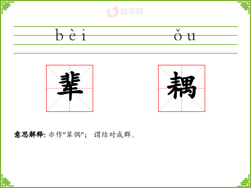辈耦的意思是:亦作"辈偶"; 谓结对成群。