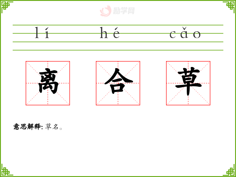 《说文》-离,离黄仓庚也。 《易·说卦》-離为雉、九家,離为鸟,为飞、为鹤、为黄。 《颜氏家训》-离则配禹。 《诗·邶风·旌丘》-流離之子。 杜甫《绝句》-两个黄鹂鸣翠柳,一行白鹭上青天。