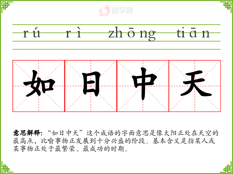 “如日中天”这个成语不仅形象生动,而且富有文化内涵,它帮助我们理解和表达事物发展的顶峰状态。在我的语言学*和表达中,这个成语是一个非常有用的工具,它丰富了我的词汇量,并帮助我更准确地传达我的思想和情感。