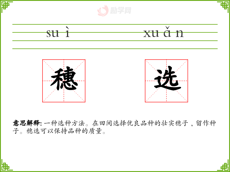 穗选的意思是:一种选种方法。在田间选择优良品种的壮实穗子﹐留作种子。穗选可以保持品种的质量。