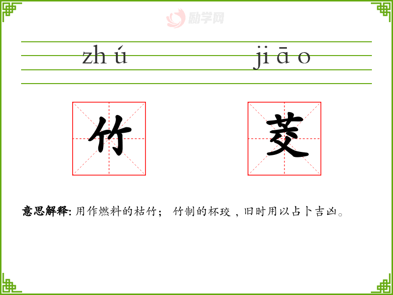 竹茭的意思是:用作燃料的枯竹; 竹制的杯珓﹐旧时用以占卜吉凶。